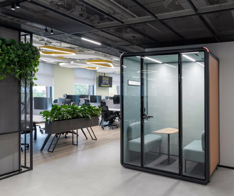 The HECOR office pod is equipped with a high-efficiency ventilation system and adjustable lighting, ensuring comfort during extended use and allowing employees to focus on their tasks without external distractions.